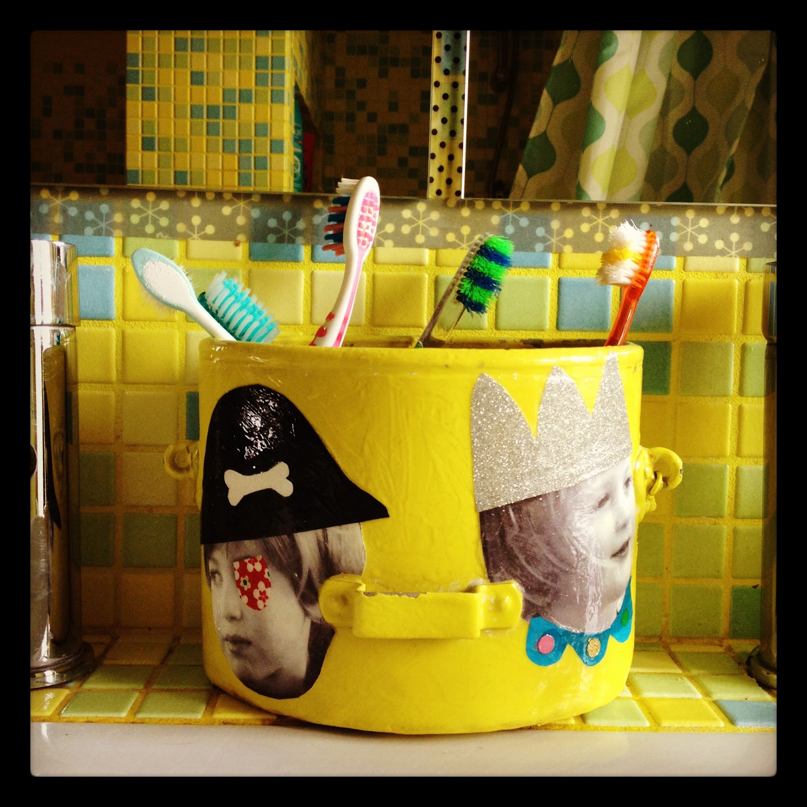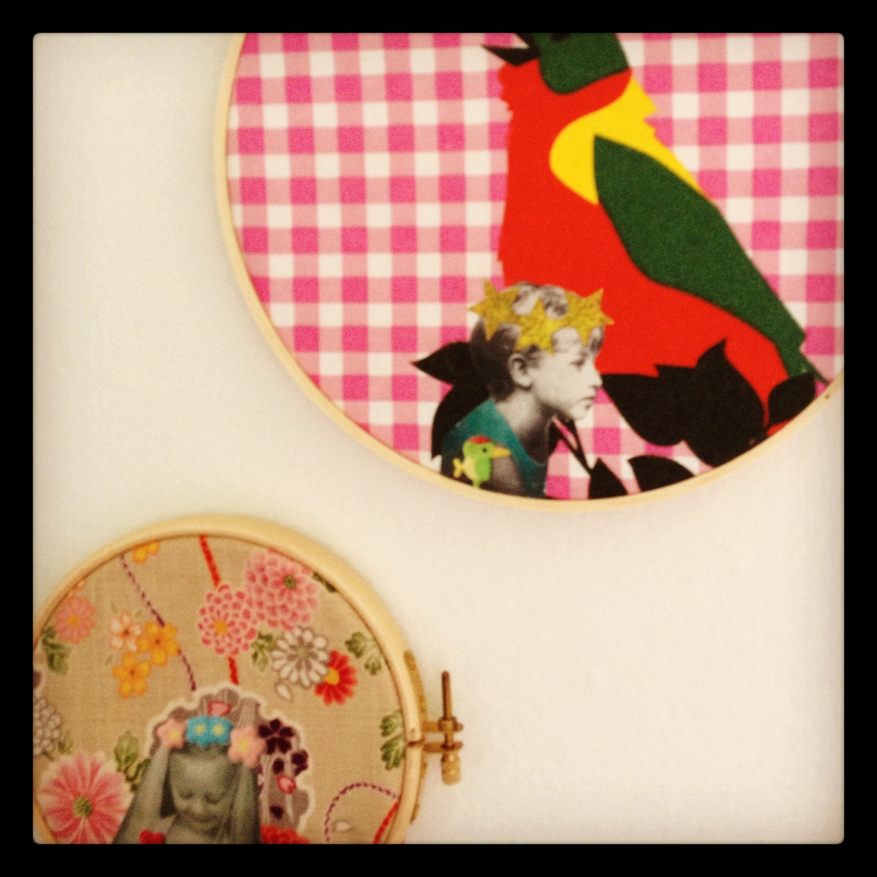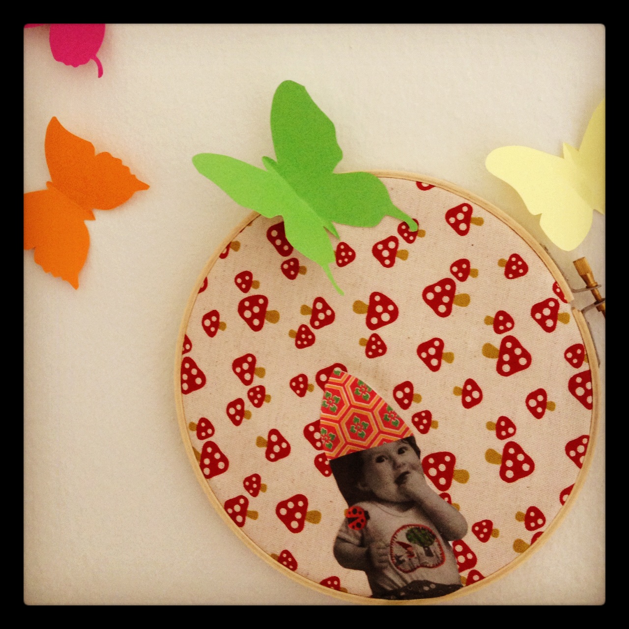 A questo punto le patasagome sono pronte per essere incollate un po’ dove si vuole! Su un cartoncino che ahime’ va nuovamente ritagliato, su una vecchia schiscetta trasformata in porta spazzolini, su dei cerchi da ricamo usati come cornici.