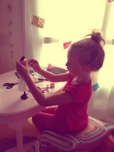 Intanto Patasgnaffa fremeva in preda al sacro fuoco della creatività (il gioco si chiama Creations mica per altro…) e così mi sono rassegnata a passare ancora del tempo tra forbici e cartamodelli. Invece a sorpresa Patasgnaffa una volta assimilato il concetto, scegli il modello, ritaglia il cartamodello, trasferiscilo sulla stoffa, ritaglia la stoffa, è andata avanti in totale autonomia mentre io rincorrevo Godzilla… L’anno prossimo ad Abilmente ci mando lei!