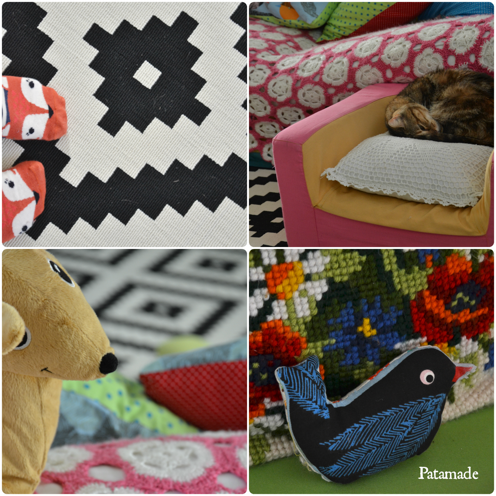 Cara Olga, spero che la trs funzioni alla grande e cancelli ogni dolore. Intanto questo tappetto mette in valore tutti i colori che lo circondano. non sbagli mai maga dei colori! (Quelle tende con uccellini sono fantastiche, posso copiare -provare almeno- questi disegni deliziosi?)