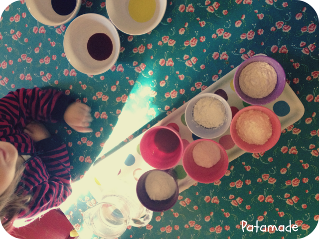 E così abbiamo versato, mescolato, strizzato ed impastato per un tempo incredibilmente lungo fino ad ottenere quattro panetti di una pasta morbida e colorata.