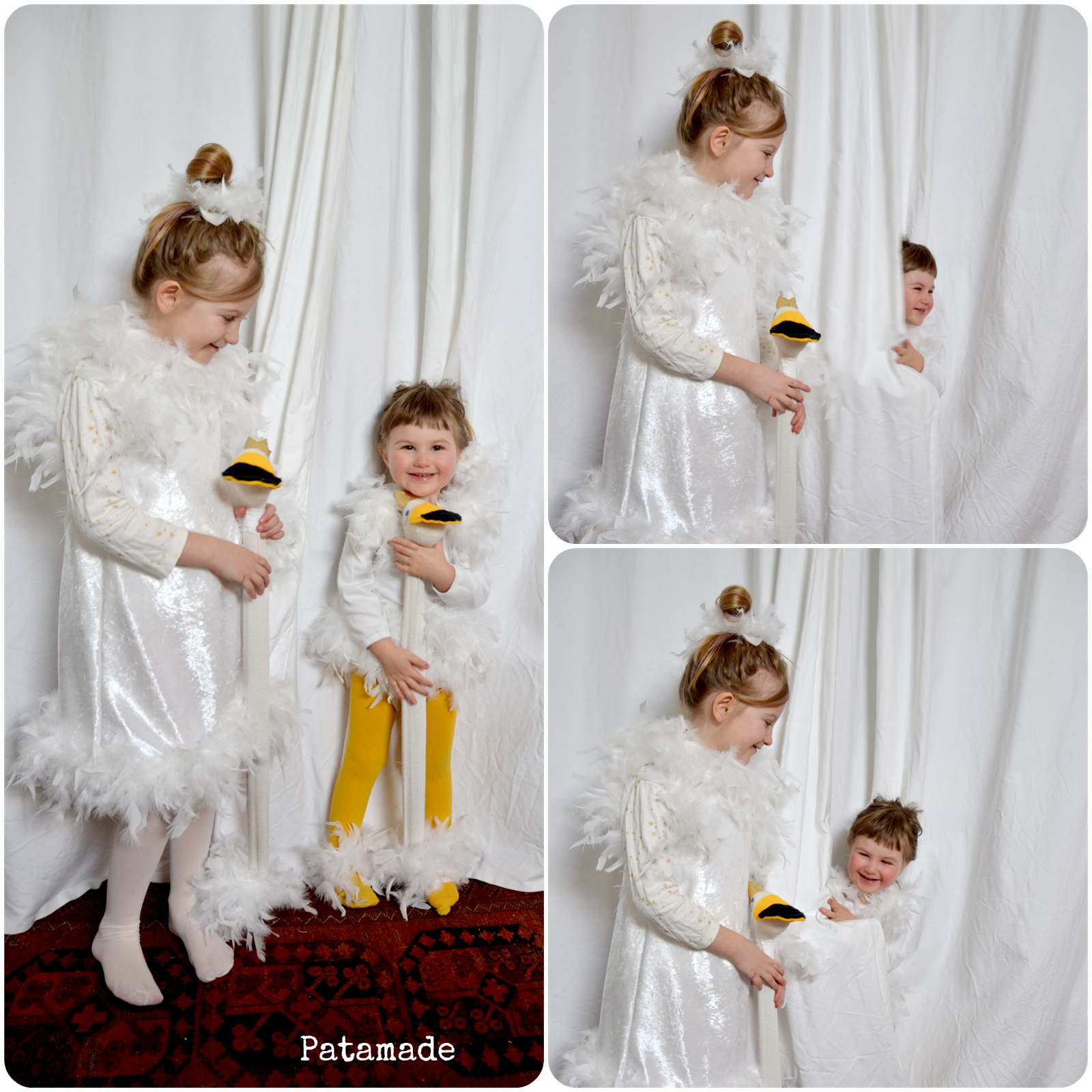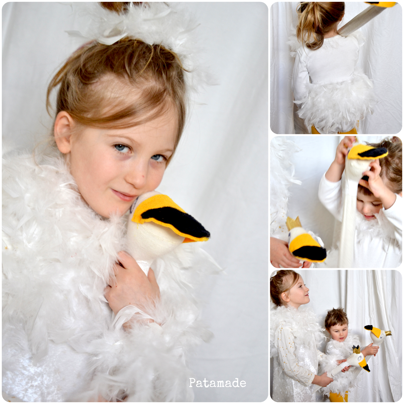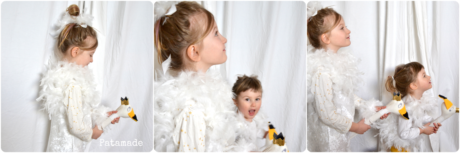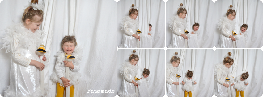 Comunque eccoli qui i miei due piccoli cigni, non truccati, scalzi e non in riva al lago come avevo immaginato. Cioè io avevo la scenografia perfetta e non l’ho usata. Snifferò piume per punizione, anzi no quello l’ho già fatto confezionando i vestiti.