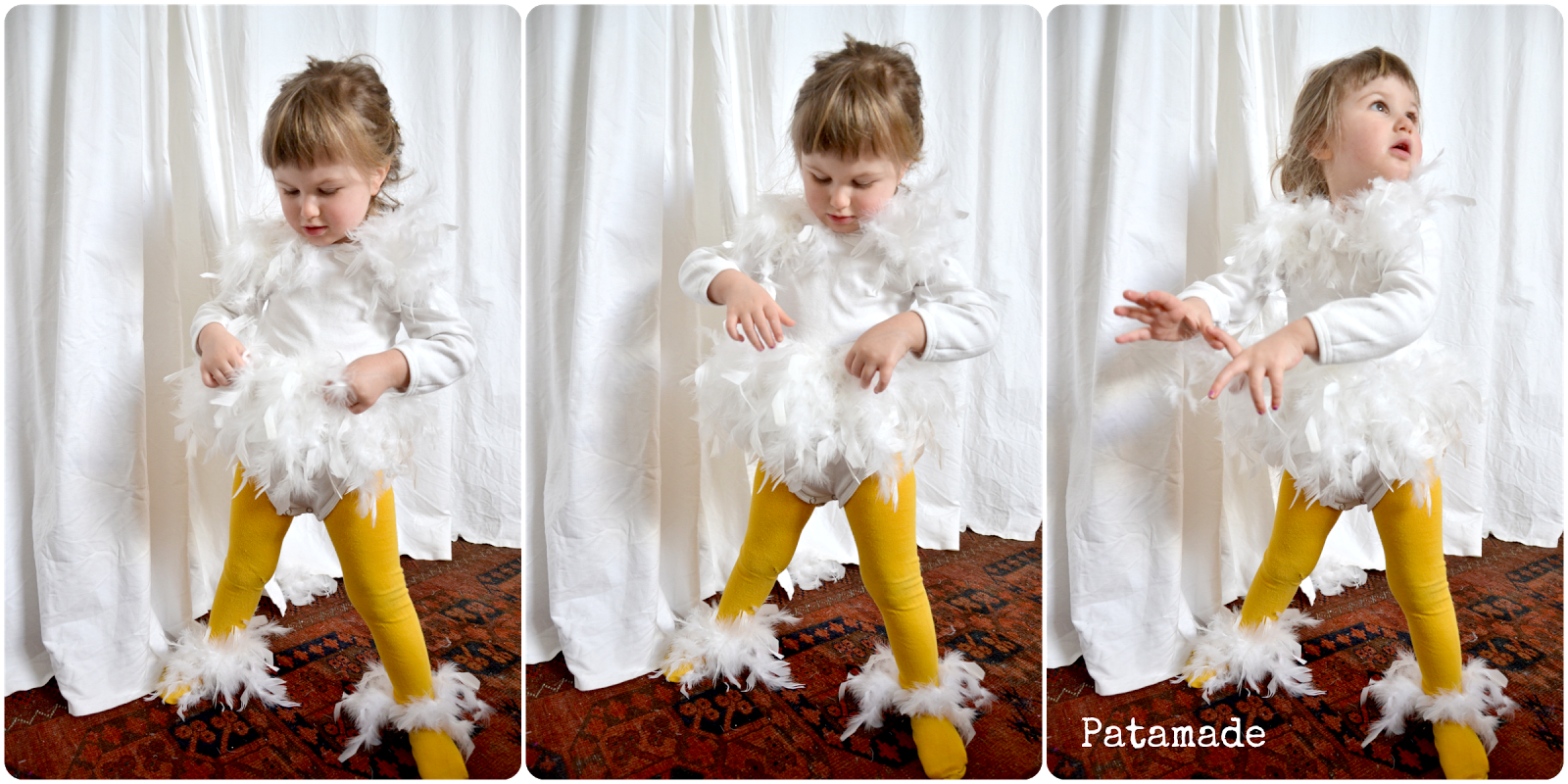 Il costume di Patagnoma è invece un semplice body bianco, a cui ho cucito due giri di piume intorno alla vita e due piccole applicazioni ai lati dello scollo. Avevo paura che troppe piume la infastidissero troppo, e avevo ragione!