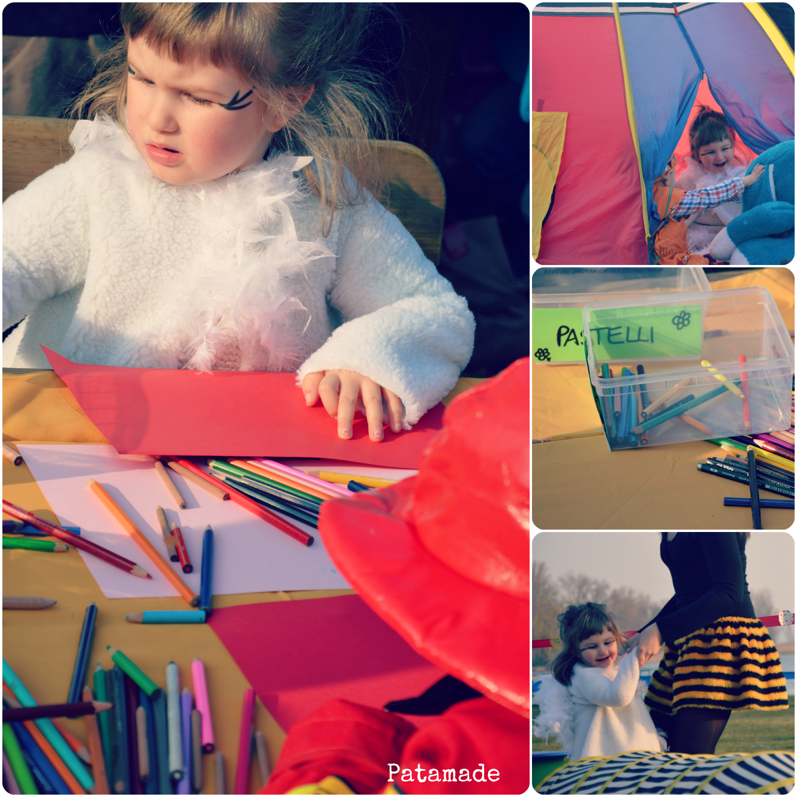 Venerdì la scuola era chiusa ma Patasgnaffa se ne è andata al nido con Patagnoma. Due piccole squaw, perché l’asilo non c’era più, c’era però un accampamento con indiani e cowboy che al posto del calumet della pace si scambiavano polpette e trombette.