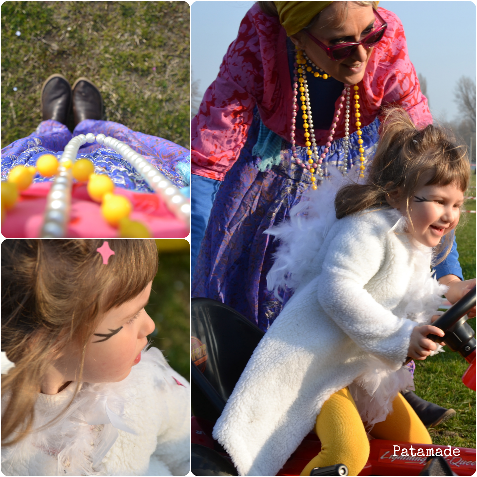 Per mia fortuna però i ragazzi che avevano organizzato il carnevale avevano fatto un bel lavoro, quindi, grazie anche alla scarsa affluenza di gente, son riuscita a riportare Patagnoma sul pratone dov’ erano stati organizzati dei giochi pseudo olimpici, del tipo: sollevamento pesci, tiro del gianduiotto, salto con il martello, sci da fondo…schiena…