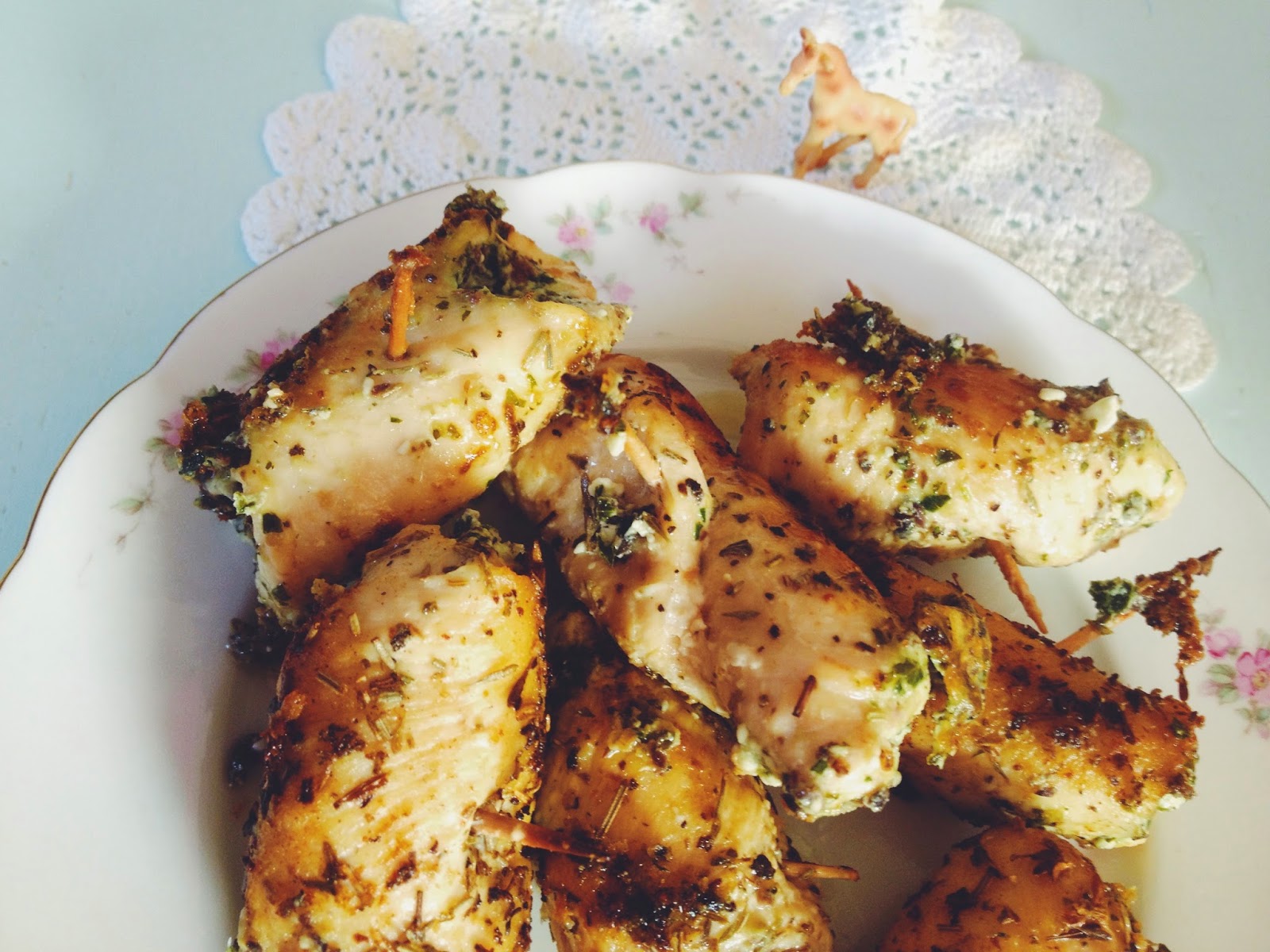 Ho ricavato dei filetti dal petto intero, applauso prego, vi ho adagiato il ripieno e ho arrotolato fermando il tutto con uno stuzzicadenti (ovviamente più di uno, uno per ogni spiedino!)