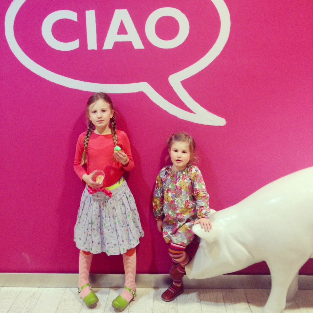 Qui eravamo alla Rinascente per un evento VogueBambini in cui venivano presentati degli abiti moto colorati e moto divertenti. Molto cari ovviamente come tutto quello che c’era nel negozio. Ho dovuto rincorrere Patagnoma per mezzo reparto con lei che satanica brandiva un vestitino Gufo molto carino, urlando “non me lo posso permettere, appoggialo subito”. Dignitosissima, come al soito.