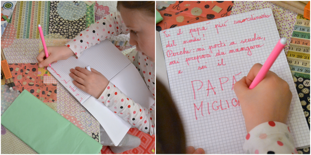 A Patasgnaffa questo desiderio di comprare regali è misteriosamente scattato per questa festa del papà e, visto che la nonna le ha dato corda e moneta, ha prodotto i seguenti regali: una penna stilografica senza cartucce, delle matite che fingono solo di esserlo e invece sono penne, un misterioso attrezzo per fare polpette, e un quaderno piuttosto bruttino. Dove però vuole scrivere di tanto in tanto dei pensierini per il suo papà, in modo che lui la possa avere sempre accanto a sé. Probabilmente non andrà mai oltre all’unico che ha scritto ieri, ma comunque lasciatemi qui a sciogliermi un po’.