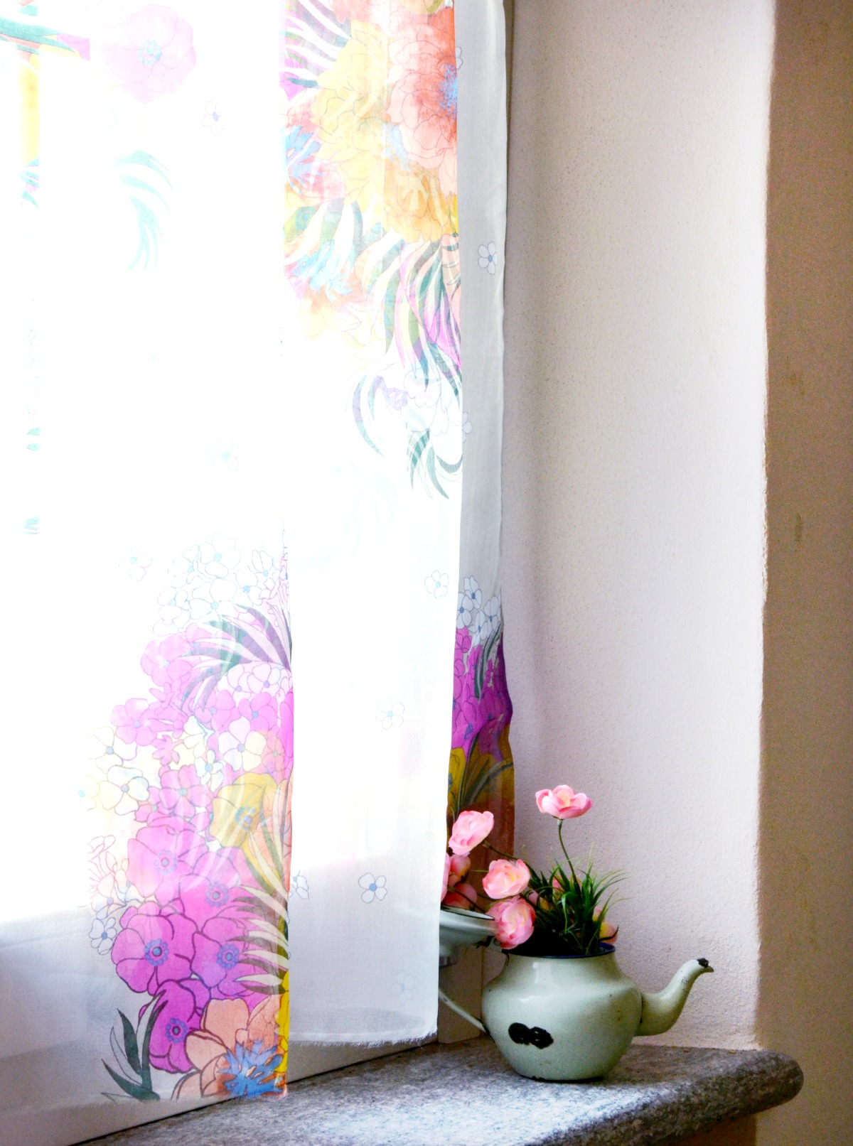 Non avrei saputo farne neanche delle tende diritte con l’orlo e tutto per la verità. Ho quindi applicato la premiata tecnica pareo a una stoffa preziosissima e in tipo dieci minuti avevo delle bellissime tende che nell’insieme non sono riuscita neanche a fotografare perché anche fotografare delle tende è un’arte che ancora non possiedo!