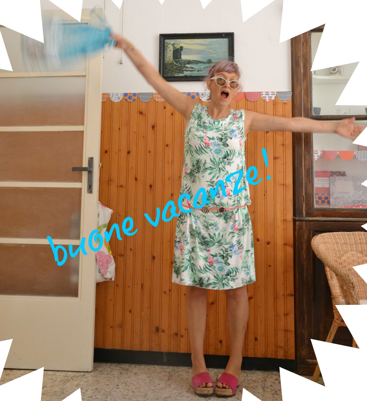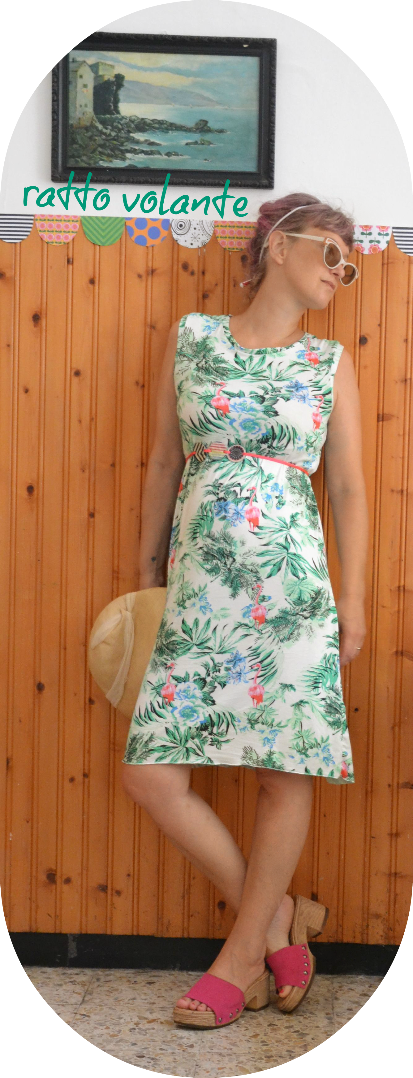 Per l'”aggiustamento” di questo costume ringrazio il cestino degli scarti del RATTO VOLANTE , che è anche l’artefice di questo vestito con i fenicotteri rosa… al mio tre innamoratevi.